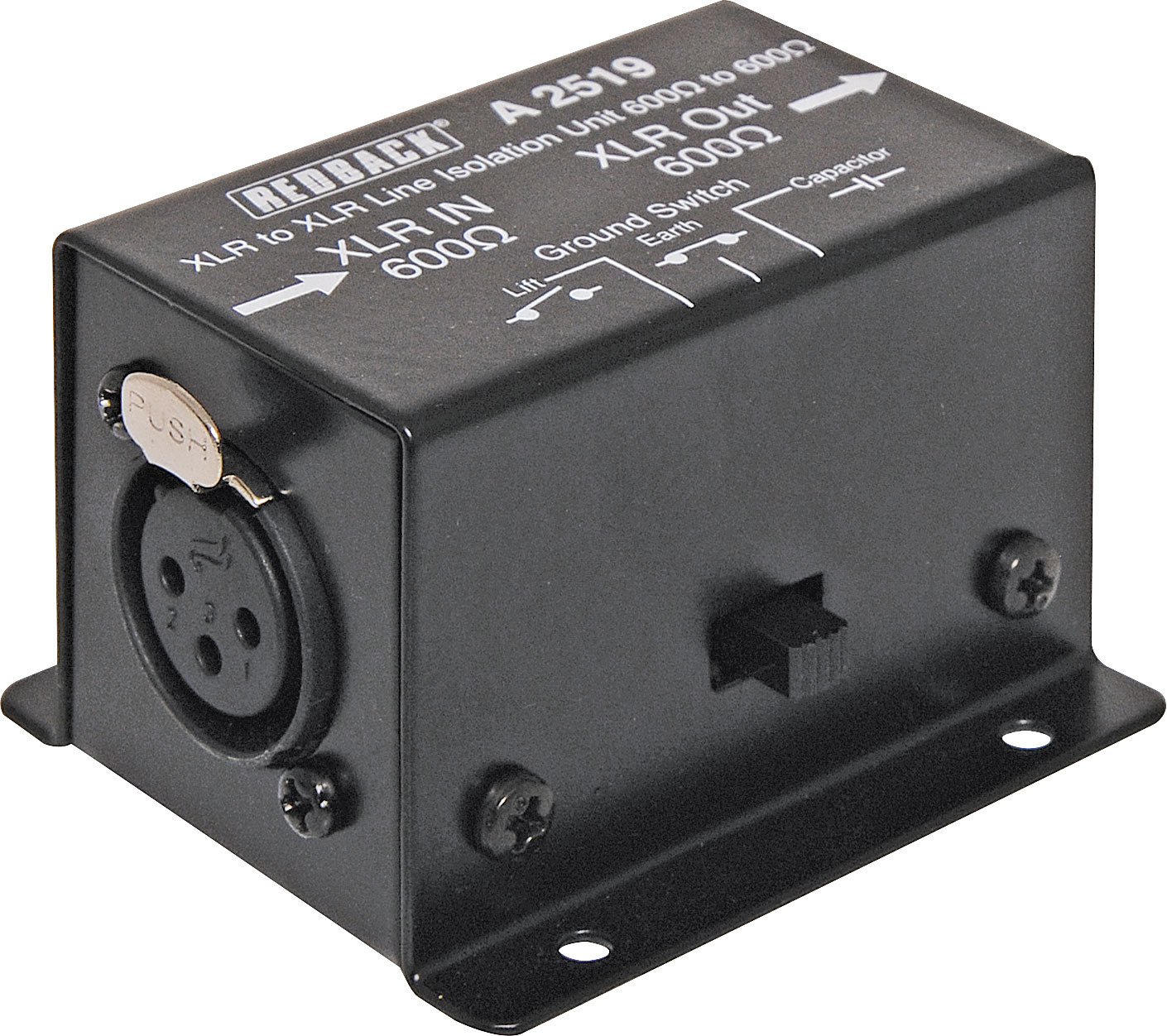 This unit is designed as an isolation unit to prevent hum loops in audio systems. Balanced 600Ω to balanced 600Ω 3 pin male XLR with ground, lift and capacitive coupling switch.