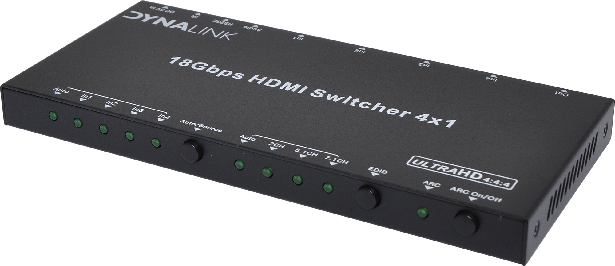 This compact 4-way HDMI switcher features manual & infra-red remote control for switching up to 4 sources to a single display supporting resolutions up to 4k 60Hz. Ideal for home theatres, showrooms, boardrooms & lecture theatres. Includes power supply & remote control. Analog and digital audio signals can be split from the HDMI signal. Audio EDID is selectable to 2.0, 5.1 and 7.1 modes. ARC function allows the audio from the selected display to be sent to the outputs provided. Automatically switches to last used input on power up. Please note: D 2341 is sold separately if RS-232 control is required. See accessories panel below.