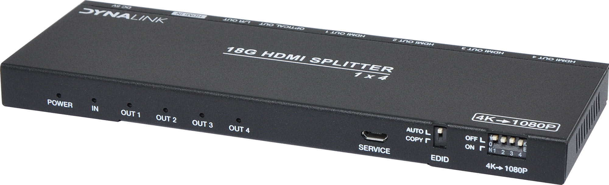 This 1x4 HDMI Splitter With Downscaler & Audio Extractor is designed to split a single HDMI source into four HDMI outputs. This allows for a HDMI source to be distributed to multiple screens within a single location such as a venue, function centre etc. It can also be used to for distributed video signage requirements. It also extracts audio from the HDMI signal and converts it into S/PDIF optical output or 3.5mm stereo jack output. Supports full 4K @ 60Hz input and output with downscale to 1080p function. Power supply included.
