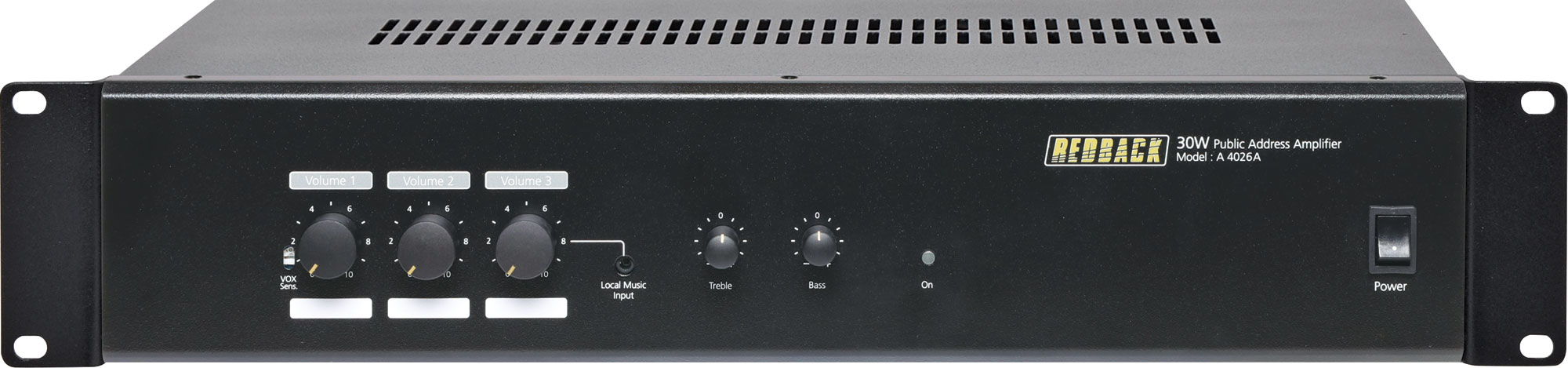 A staple of the Redback range since we first started, the 30W amplifier meets the requirements of small to medium public address installations. Features push to talk (PTT) auxiliary muting, three combined balanced microphone / stereo line inputs, tape out, and separate bass and treble controls. Offers a wide scope of installation applications, including schools, public halls, workshops and sporting complexes. Output may be 100V line or low impedance (8 - 16Ω) speaker loads. This unit features thermal overload shutdown, over current and short circuit protection.