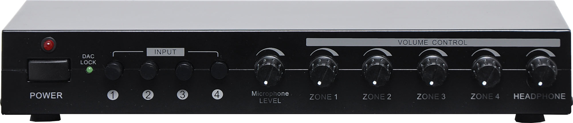 Ideal for small businesses or simple multi-zone home audio systems. Switch between up to 4 different audio sources - connect up to 8 speakers. Toslink digital audio input for TV audio. Great for background music use. Also fitted with 6.35mm microphone connection.