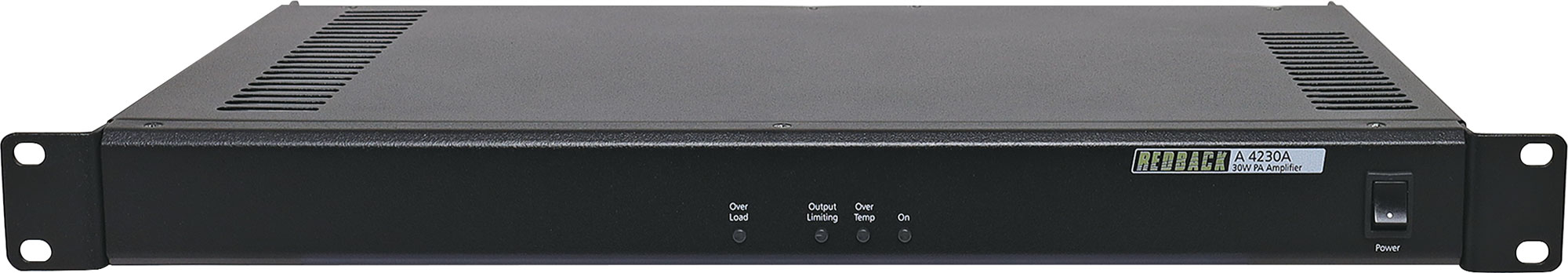 These compact 1RU rack mount amplifiers are suitable for both stand alone PA system use, or as zone amplifiers in larger systems requiring local inputs. All models operate on 240V ac or 24V dc for battery backup operation. The input consists of a 3-pin XLR which can be set for either balanced mic level (3mV) or balanced line level (2V), adjusted via a rear mounted trimpot. A dual RCA input is also provided with adjustable sensitivity of either 300mV or 1V. Phantom power is also provided on the input XLR. The circuit includes protection features in case of output over voltage, over current and over temperature. All are self re-setting once the fault condition is removed. Visual indication via front panel LEDs display amplifier status at all times.