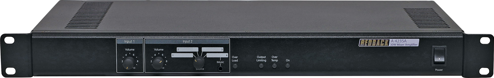 These compact 1RU rack mount amplifiers are suitable for both stand alone PA system use, or as zone amplifiers in larger systems requiring local inputs. All models operate on 240V ac or 24V dc for battery backup operation. All models include a choice of six source options on 2 inputs. Input one consists of a 3-pin XLR which can be set for either balanced mic level (3mV) or balanced line level (2V), adjusted via a rear mounted trimpot. A dual RCA is also provided on input one with adjustable sensitivity of either 100mV or 1V. Input two consists of three sets of dual RCA sockets on the rear panel and a 3.5mm jack on the front panel. Auxiliary source inputs are selected via the front panel switch. Input one can be DIP switch selectable to VOX mute input two. Phantom power is also provided on input one XLR. Volume level controls are provided on the front panel for inputs one and two. The circuit includes protection features in case of output over voltage, over current and over temperature. All are self resetting once the fault condition is removed. Visual indication via front panel LEDs display amplifier status at all timesΒ.