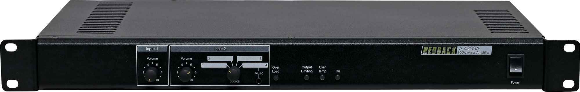These compact 1RU rack mount amplifiers are suitable for both stand alone PA system use, or as zone amplifiers in larger systems requiring local inputs. All models operate on 240V ac or 24V dc for battery backup operation. All models include a choice of six source options on 2 inputs. Input one consists of a 3-pin XLR which can be set for either balanced mic level (3mV) or balanced line level (2V), adjusted via a rear mounted trimpot. A dual RCA is also provided on input one with adjustable sensitivity of either 300mV or 1V. Input two consists of three sets of dual RCA sockets on the rear panel and a 3.5mm jack on the front panel. Auxiliary source inputs are selected via the front panel switch. Input one can be DIP switch selectable to VOX mute input two. Phantom power is also provided on input one XLR. Volume level controls are provided on the front panel for inputs one and two. The circuit includes protection features in case of output over voltage, over current and over temperature. All are self re-setting once the fault condition is removed. Visual indication via front panel LEDs display amplifier status at all times.