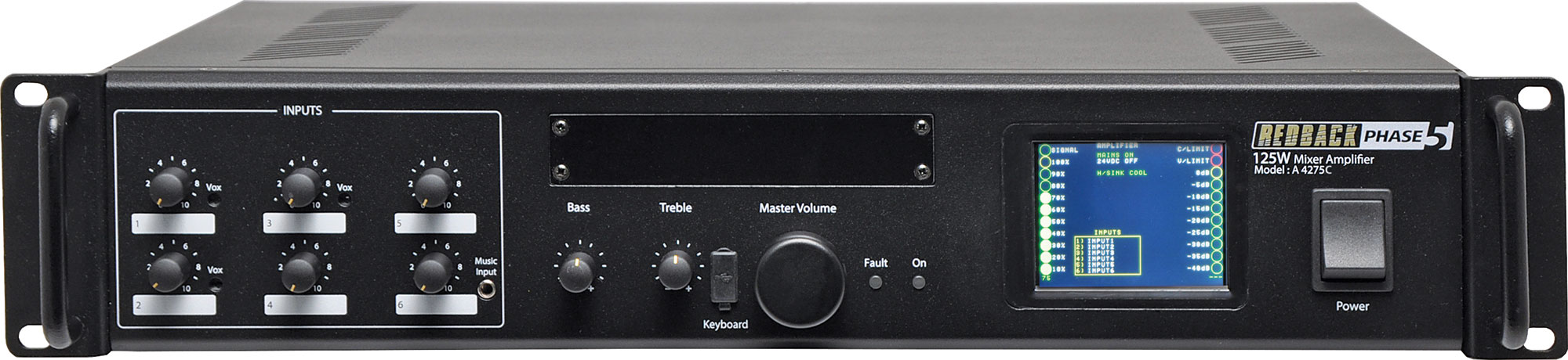 Engineered for professional PA installations, the A 4275C conservatively delivers 125W RMS power. Including three levels of input priority, bass and treble controls and phantom powering capability enable unparalleled flexibility for a wide scope of applications such as schools, shopping centres, workshops, mine sites and office buildings.