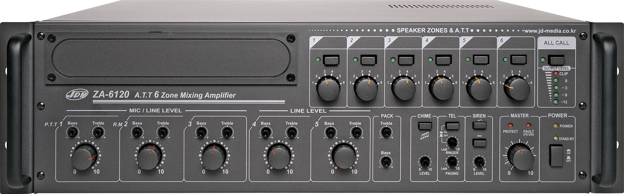 Housed in a heavy duty 3RU rack mount cabinet, these mixer amplifiers include a host of features and are ideally suited for schools, offices, medical suites, office/factory units etc. Each of the first three inputs can be configured for either microphone or auxiliary use, whilst the last two are for dedicated auxiliary use. Along with this, the amplifier provides 6 output zones with individual in-built attenuators. Each zone is able to be activated on or off via the front panel switches. LEDs indicate when each zone is selected. All zones can be selected on via the β€œall call” switch.