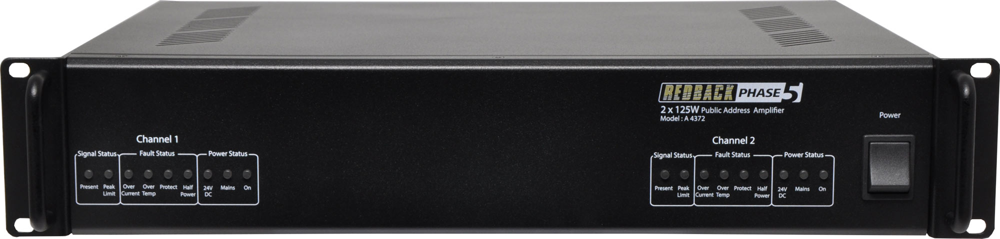 Manufactured in Australia to stringent engineering criteria, the Phase 5 amplifier series exhibit quite remarkable performance and outstanding reliability. Over 2 years in design and development, the evolution of Phase 5 included extensive consultation and input from pro sound contractors and installers across the country. The host of features incorporated commend this amplifier series to the most demanding of pro sound and industrial PA system applications. Redback Phase 5 amplifiers incorporate on demand multi-staged thermally cued fan forced cooling. The output power stage is thermally monitored enabling automatic operation of a long life computer style cooling fan to "off" or "on" air flow through a specially designed tunnel heatsink. In quiescent or ordinary cycle paging mode the fan is inoperative. Over temperature sensing is employed to shut down the amplifier in extreme over heat conditions, eg extreme over load and /or over drive misuse. Reβstart is automatic once normal temperatures are attained. Output peak limiting. The output voltage is limited to 105V maximum RMS voltage irrespective of load impedance to prevent damage to speaker load. Standard 100V line PA amplifiers can deliver up to 180 volts or more under conditions of high drive and very light loading. This output over voltage can quickly destroy any loudspeakers connected.