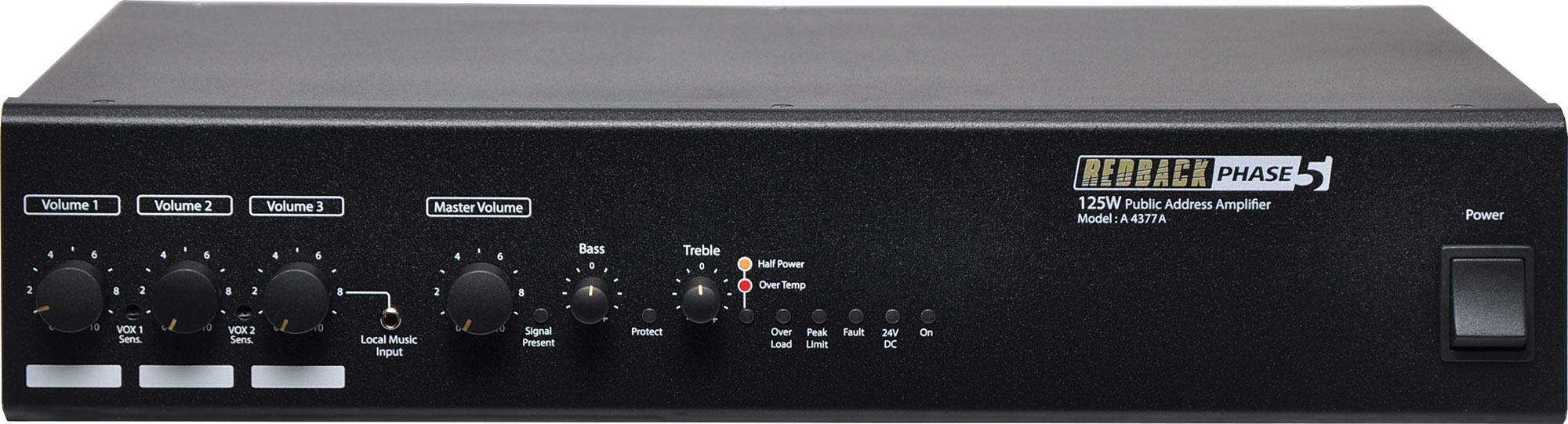 The Redback A 4377A 125 Watt 4 channel mixer amplifier is specifically designed for applications requiring up to three microphone inputs, without compromising output power and overall performance. The amplifier features three inputs which can be configured for either microphone or line level operation. Dimensions: ˜483W x 300D x 88H. The A 4377A conservatively delivers 125W RMS power, while the A 4387A (see related below) delivers 250W RMS. Frequency response extends from 50Hz to 15kHz ±3dB at a total harmonic distortion (THD) of less than 0.5% @ 1kHz. Vox muting is provided on inputs one and two, which, when activated, automatically mutes the other inputs. Bass and treble controls and phantom powering capability enable unparalleled flexibility for a wide scope of applications such as factories, workshops, mine sites, sports clubs and office buildings. The amplifiers operate from 240V AC mains or 24V DC permitting battery backup operation during mains power failure. The output comes standard suitable for a 100V line load, but this can be configured internally to 70V line or low impedance (4 - 16Ω) loads. Thermal overload, overcurrent and overload protection circuitry and fuses on both AC and DC provide excellent fault condition protection and robust performance. The amplifier also utilises a half power mode which enables the amplifier to continue to run at a reduced output level if it is being over driven. Tape output sockets are provided for recording purposes or feeding into additional power amplifiers. Remote volume available when A 4373 Digital volume control module fitted internally and external A 2280B wall plate or 1KΩ potentiometer connected. Alert and Evacuation tones (conforming to AS1607.4) along with chime tones and voice over message option available when optional A 4573 fitted.
