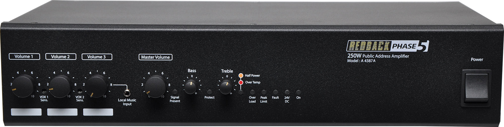 The Redback A 4387A 250 Watt 4 channel mixer amplifier is specifically designed for applications requiring up to three microphone inputs, without compromising output power and overall performance. The amplifier features three inputs which can be configured for either microphone or line level operation. Dimensions: ˜483W x 300D x 88H. The A 4377A (see related below) conservatively delivers 125W RMS power, while the A 4387A delivers 250W RMS. Frequency response extends from 50Hz to 15kHz ±3dB at a total harmonic distortion (THD) of less than 0.5% @ 1kHz. Vox muting is provided on inputs one and two, which, when activated, automatically mutes the other inputs. Bass and treble controls and phantom powering capability enable unparalleled flexibility for a wide scope of applications such as factories, workshops, mine sites, sports clubs and office buildings. The amplifiers operate from 240V AC mains or 24V DC permitting battery backup operation during mains power failure. The output comes standard suitable for a 100V line load, but this can be configured internally to 70V line or low impedance (4 - 16Ω) loads. Thermal overload, overcurrent and overload protection circuitry and fuses on both AC and DC provide excellent fault condition protection and robust performance. The amplifier also utilises a half power mode which enables the amplifier to continue to run at a reduced output level if it is being over driven. Tape output sockets are provided for recording purposes or feeding into additional power amplifiers. Remote volume available when A 4373 Digital volume control module fitted internally and external A 2280B wall plate or 1KΩ potentiometer connected. Alert and Evacuation tones (conforming to AS1607.4) along with chime tones and voice over message option available when optional A 4573 fitted.