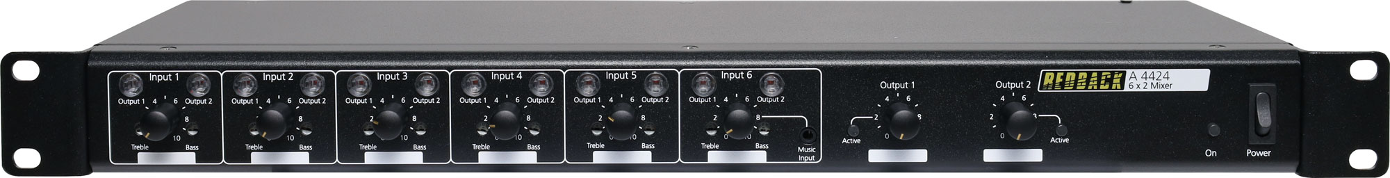 This Redback PA mixer incorporates six inputs which can be routed to 1 of 2 outputs or both as the installation requires. Inputs can be configured for either RCA line level signals or 3 pin XLR balanced mic signals. Outputs are via RCA and 3 pin XLR balanced 1V signals. Front panel controls including volume, treble and bass are included for each input. Independent master volume controls are provided for each output. Pushbutton switches are provided to enable inputs to be switched to either output 1, output 2 or both outputs 1 and 2. DIP switches allow for each input sensitivity to be set to 100mV and phantom power on/off, and choice of RCA or XLR connection for that chosen input. All housed in a low profile 1RU 19” rack mountable case.