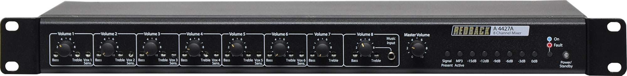 This unique Redback PA mixer features six input channels which are user selectable for either balanced mic or line as well as two dedicated line level RCA inputs and a 3.5mm audio jack for portable devices. The unit has six levels of VOX priority on inputs 1-6 with adjustable VOX sensitivities on each input, and a 24V DC output (limited to 120mA current draw) which becomes live when any triggers are activated or VOX/PTT circuitry becomes active. In addition it incorporates a MP3 based message player for playback of Alert, Evacuation or Chime tones. The Alert and Evacuation tones once triggered, will mute inputs 2-8, regardless of their priority settings.