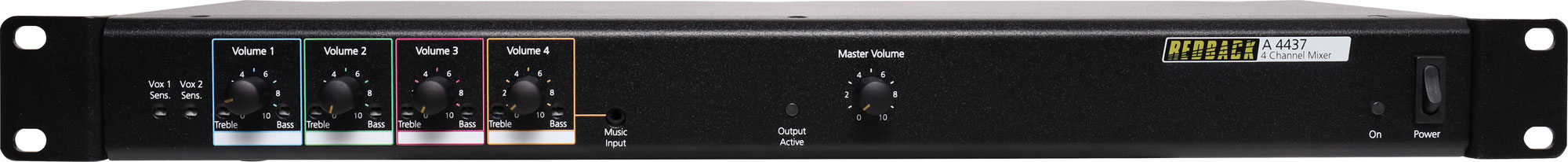 Many large commercial buildings these days employ two PA systems. One is the traditional PA/BGM system for every day paging and music distribution. The second is a stand alone emergency evacuation PA system for use in the event of a fire or other emergency. This mixer has been designed for such installations. It works as a stand alone audio processor with four mic/line inputs for microphone and music sources. Plus it has a set of contacts connected to the buildings Fire Indicator Board (FIB). When the FIB operates it triggers these contacts, rending the local PA/BGM system inoperative so the main emergency evacuation system has precedence. All inputs can be configured for either balanced mic via 3 pin XLR or line inputs via RCA. Line input sensitivity is adjustable from 100mV to 1V using rear mounted DIP switches. Phantom power is also available on all inputs. Outputs are either balanced 3 pin XLR or stereo RCA connectors. Individual & master level controls are provided on the front panel along with recessed treble and bass adjustments. Provision is included for the A4573 alert/evac module which generates pre chime, bell, alert and evacuation tones. The alert tone can function continuously, or switch to evac tone after a preset time delay (adjustable 30 seconds to 4.5 minutes). Simply connects to the mixer internally via the cable provided.