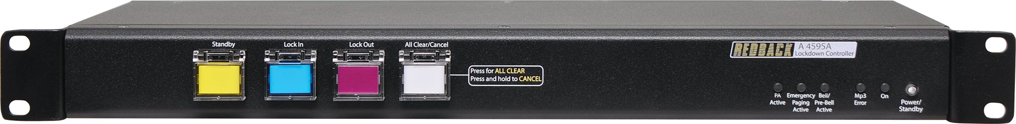 This lockdown controller complements the A 4565 alert/evac controller and is primarily aimed at schools which require a lockdown warning facility. The controller has provision for a period bell plus a standby, lockdown and all clear tones. These can be activated by the switches on the front panel, by the remote closing contact triggers on the rear of the unit or by the optional wall plate (A 4598) or paging console (A 4660). A pre bell/chime/tone is also included which can only be triggered by the closing contact on the rear of the unit. All tones are stored on an SD card in MP3 format. Using MP3 files gives the user complete control over the sounds played for each tone. This could be music, a pre-recorded tone or speech etc. The standby and lockdown tones can also be set to loop/repeat via external DIP switches. The order of priority from highest to lowest is all clear, lockdown, standby, bell and pre-bell. If the period bell is activated the period bell switch on the front of the unit will illuminate until the tone finishes. If the standby or lockdown tone is activated, the corresponding switch on the front of the unit will illuminate until the tone finishes. After this, the switch will continue to illuminate until the lockdown overrides the standby condition or the all clear condition is activated. If the all clear tone is activated the all clear switch will illuminate until the tone finishes. If any wall plates or paging consoles are connected the switches or LEDs on these units will illuminate accordingly. The unit is powered from a 24V DC source (power supply included) and separate 24V DC switched outputs are supplied for remote triggering (of sirens/strobes etc) for all tone conditions (pre-bell, period bell, standby, lockdown and all clear). Connections to the paging consoles and wall plates are made via Cat5e cabling. Up to four paging consoles or 16 remote wall plates can be connected at one time. A standard line level output is provided for connection to the schools PA system. The lockdown unit can be connected to the A 4565 alert/evac controller if an EWIS system is also required.