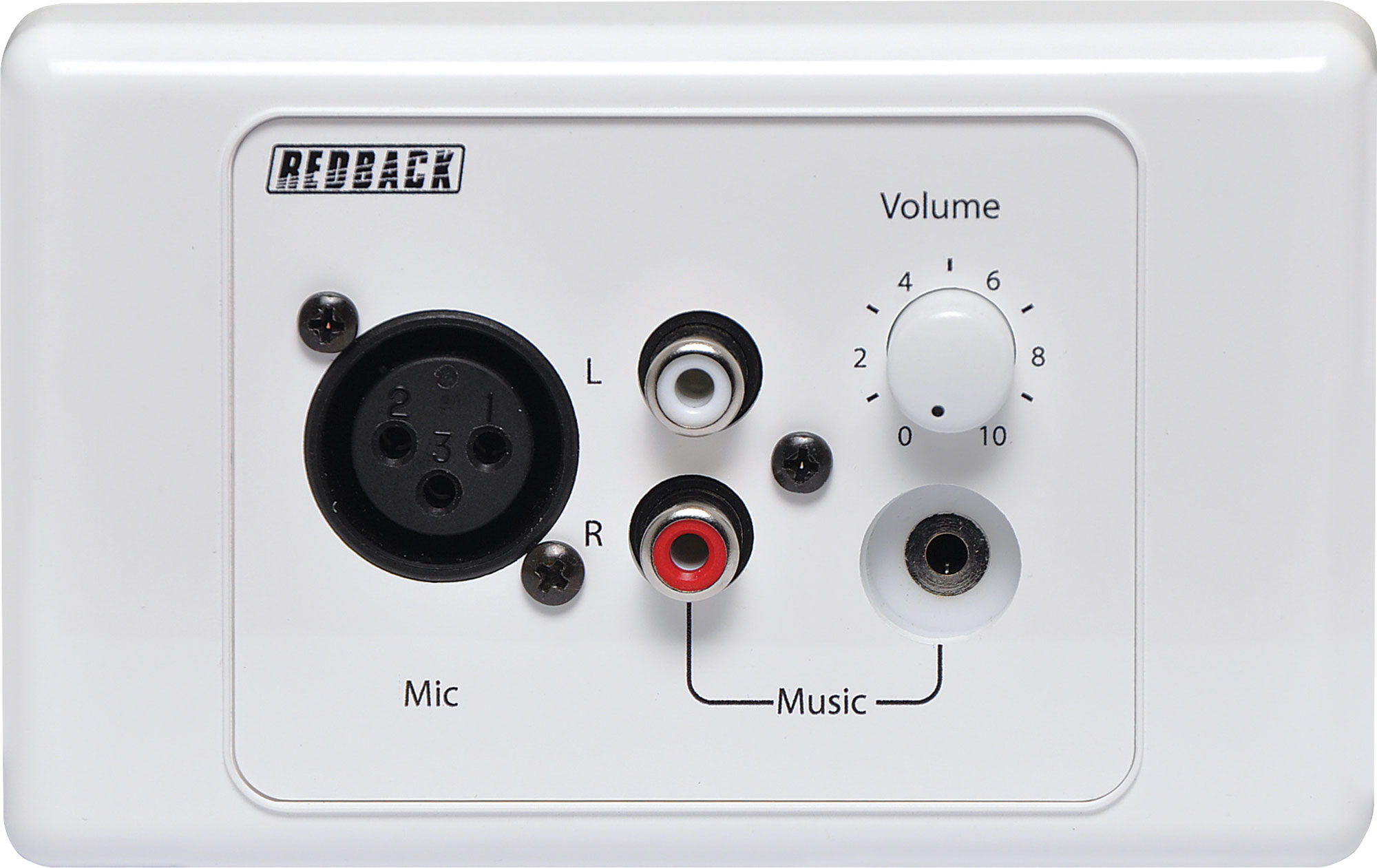 This mic/line pre-amplifier wall plate accepts either a microphone or line input and converts the signal to a balanced high level output. The 3V output signal is carried via Cat5e cable, (suitable for distribution up to 300m without interference) back to a Redback compatible UTP receiver unit. Mic input is via a balanced XLR whilst the line input is via 2 x RCA sockets or 3.5mm audio jack for portable devices with a lower level line output. Power is supplied to the wall plate over the UTP cabling. All wall plates assembled by Altronics are supplied with two facia clip on covers. These are designed to match your current decor. Simply clip on the desired cover after installation. Use with Redback A4480B and A4432 The wall plate provides a means of overriding the input to a zone with a local input source located in that zone. An example may be a mobile phone for background music or a microphone for speeches at a wedding function.
