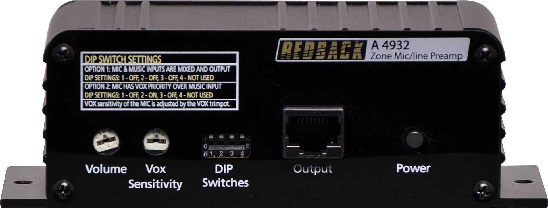 This Balanced Microphone/Line Pre Amplifier accepts either a microphone or line input for conversion to a balanced high level signal. Mic input is via a balanced XLR whilst the line input is via 2 x RCA sockets or 3.5mm jack. The 3V output signal is carried via Cat5e cable (suitable for distribution up to 300m without interference) to the A 4928 line output box (or other Redback UTP compatible product) which provides a balanced high or low level output and an unbalanced Aux output signal to be fed into an amplifier. Power is provided through the Cat5e cable connection. A 24V DC switched output (limited to 120mA current draw) is available to activate when the VOX output of the pre-amplifier is active. Use with Redback A4432 When used with A4432 it provides a means of overriding the input to a zone with a local input source located in that zone. An example may be a mobile phone for background music or a microphone for speeches at a wedding function. Both the wall plate and box have connections for a 3 pin XLR microphone, dual RCA line level input and a 3.5mm line level input for portable devices.