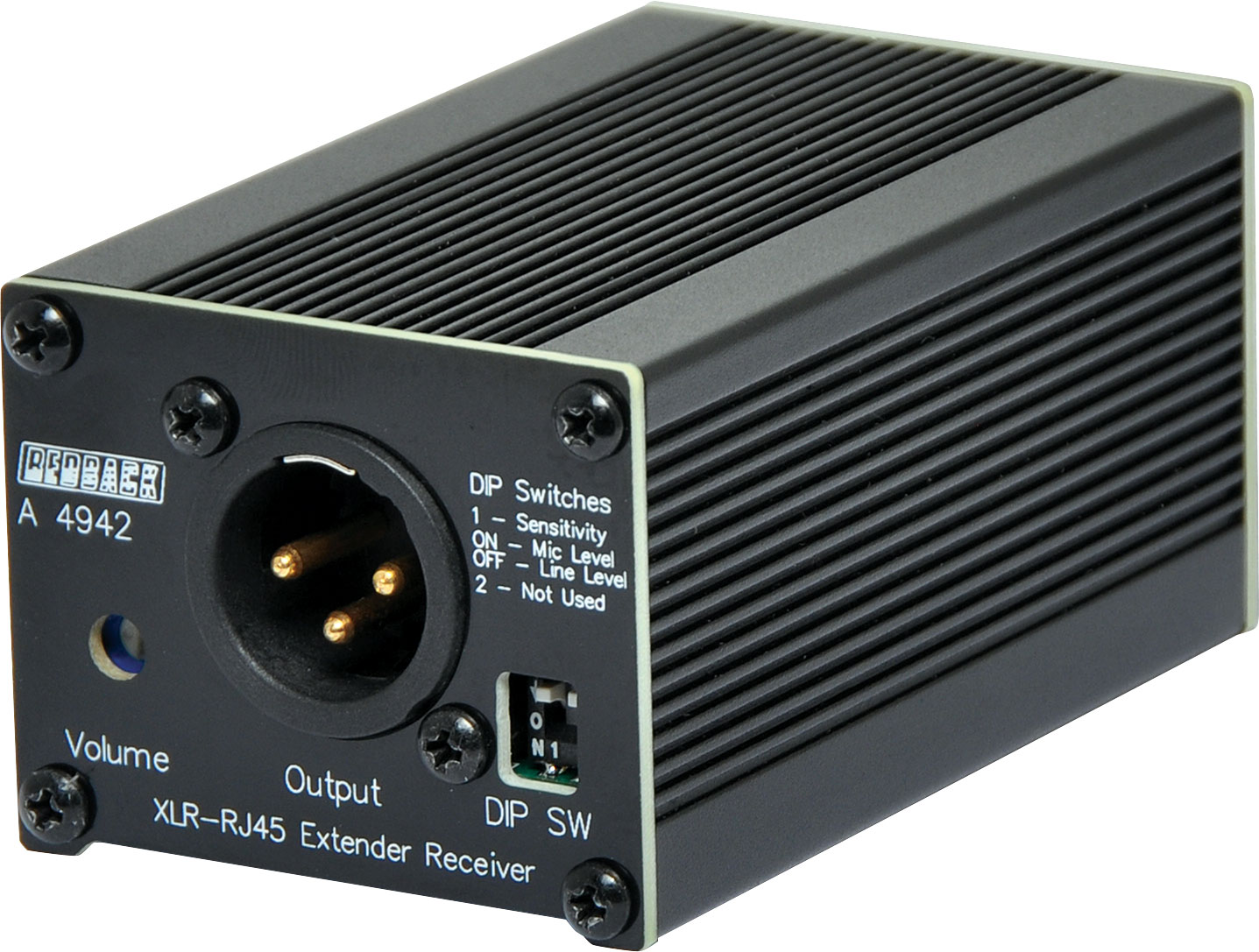 This 3 pin XLR UTP receiver accepts signals from compatible Redback UTP solutions transmitters and converts the signal to a balanced XLR output. The output level is DIP switch selectable, and the output volume is screwdriver adjusted via the trimpot on the front of the unit.The unit is powered from 24V DC, which can be connected to the DC socket on the rear, or it can be supplied through the Cat5/6 cabling from other compatible Redback products (see connection matrix). A 24V DC plugpack is supplied for connection to the DC socket. The Redback A 4942 can be connected to compatible Redback products such as the A 4940 and A 4944.