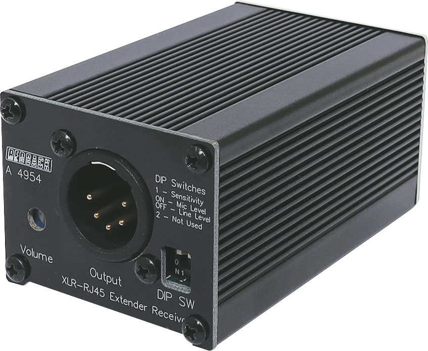 This 5 pin XLR UTP receiver accepts signals from compatible Redback UTP solutions transmitters and converts the signal to a balanced XLR output with PTT connection. The output level is DIP switch selectable, and the output volume is screwdriver adjusted via the trimpot on the front of the unit. The unit is powered from 24V DC, which can be connected to the DC socket on the rear, or it can be supplied through the Cat5/6 cabling from other compatible Redback products (see connection matrix). A 24V DC plugpack is supplied for connection to the DC socket. The Redback® A 4954 can be connected to compatible Redback® products such as the A 4952 and A 4953. These units carry the balanced output and push-to-talk (PTT) signal to the A 4954 ensuring seamless operation for paging microphones (PTT connects to pins 4 and 5 of the XLR socket).