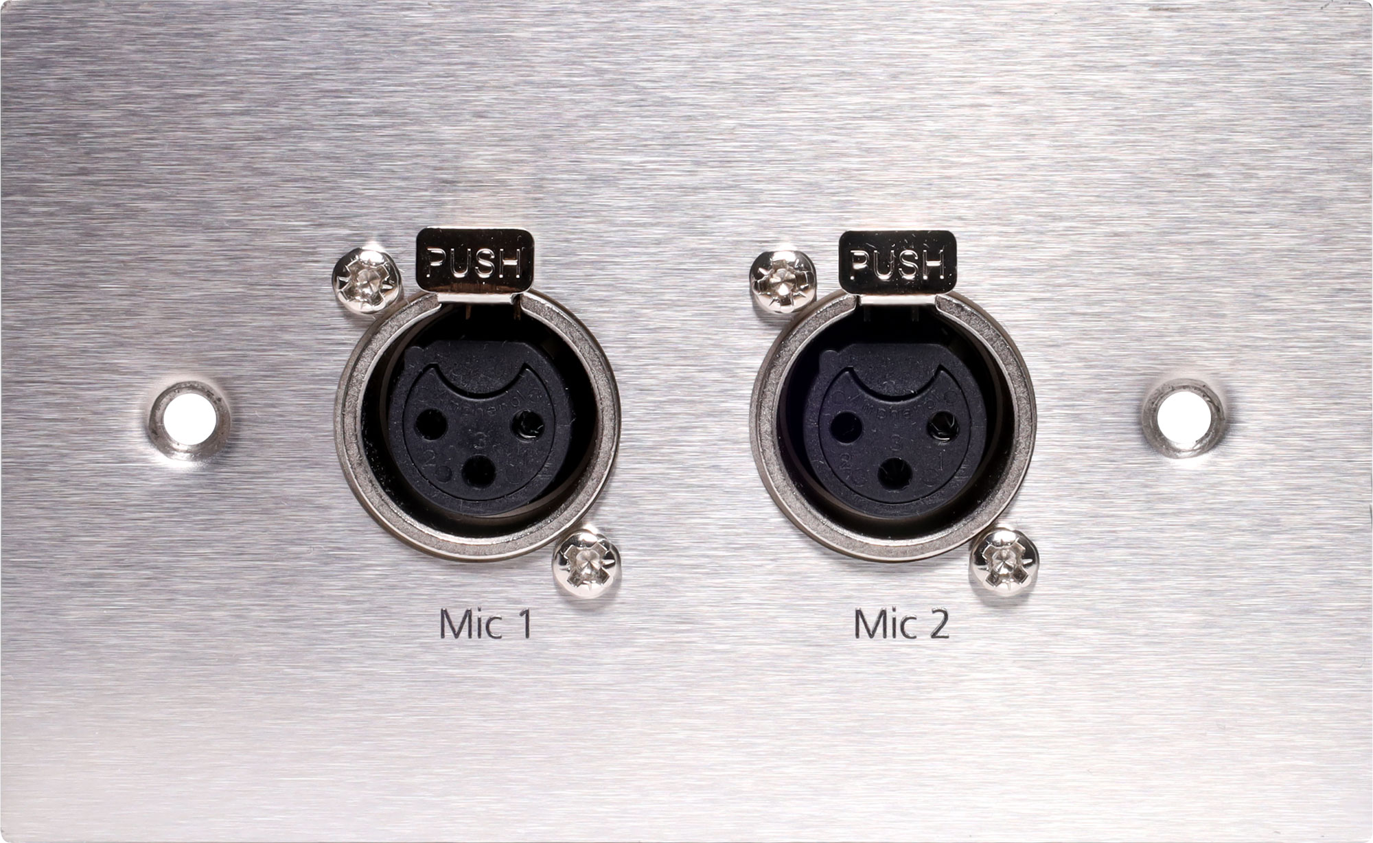 Dual 3 pin XLR microphone connectors mounted horizontally on a brushed stainless steel wall plate. “One-Shot” version with screw terminal connections for quick and easy connection on site.