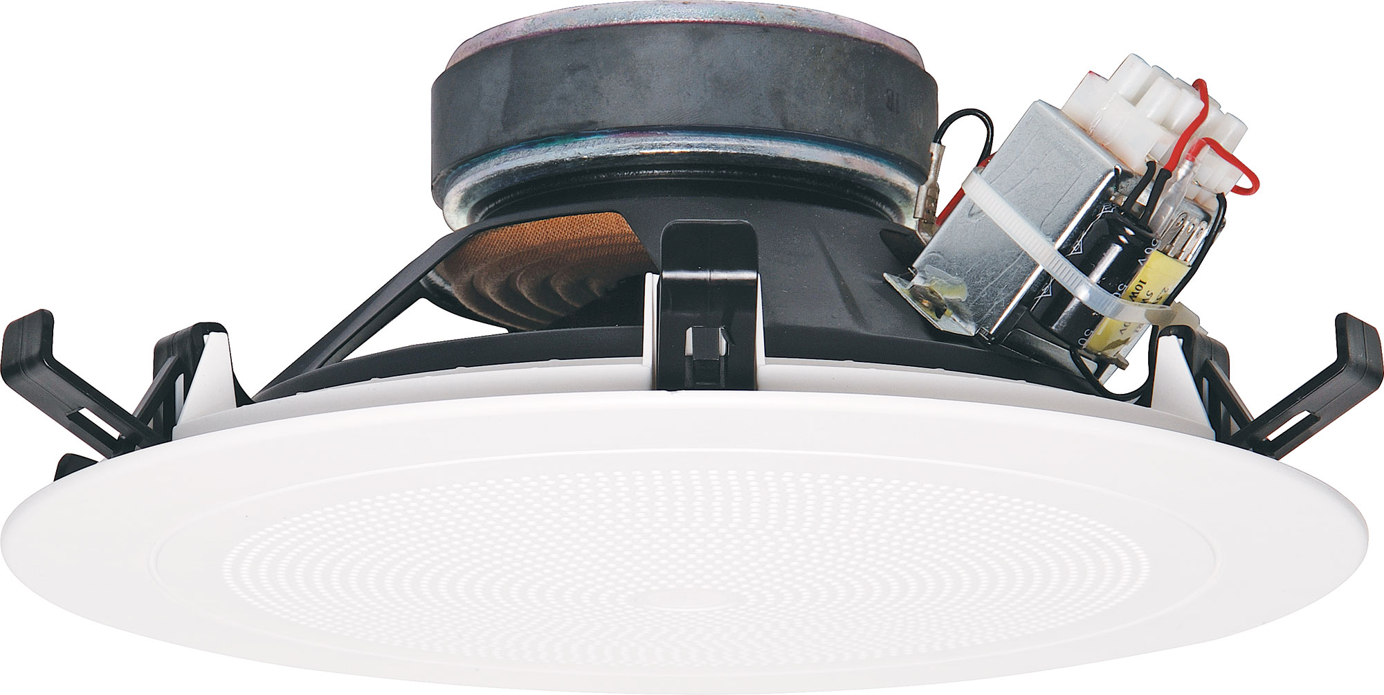 Redback® “One-Shot®” speaker assemblies install in seconds. They simply snap fit to any 10-13mm thickness ceiling by means of the integral pressure clips. The labour cost savings for the pro sound installer are both obvious and substantial. The snap clip material is formulated to retain long service life strength and spring action, ensuring a snug vibration free fit to either gyprock tiles, mineral fibre tiles or fixed gyprock ceilings. This model is a coaxial type speaker suitable for commercial and industrial use, utilising 100V line systems and fitted with a 2 way terminal block. Attention PA Installers! Using these speaker assemblies greatly reduces installation time compared to a standard speaker & grill combination. Typically, you will save about 5 minutes per speaker point. This equates to a significant saving in labour costs.