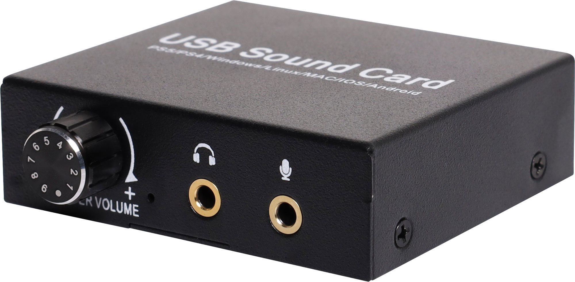 A compact USB sound card with mic and headphone connections. Level controls for volume and bass adjustment are provided. Connects to devices with USB type C to A cable (included). Supports PCM audio sign 16-bit 48KHz sampling rate. Suitable for use with 16-600Ω headphones/speakers. Size: 71 x 80 x 21mm.
