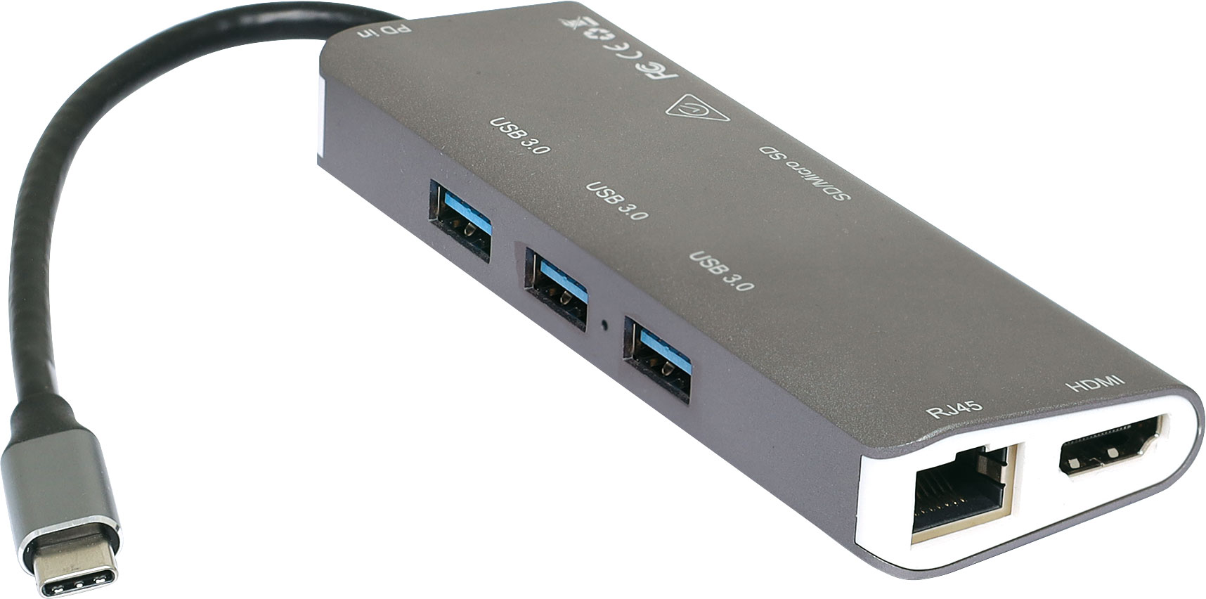 A compact hub providing connection for an external monitor via HDMI up to 4K @ 30Hz. Connects to USB type C devices and provides connection for external peripherals via 3 x USB 3.0 ports, SD card slot, Micro SD card slot, gigabit wired ethernet port and external monitor connection via HDMI.