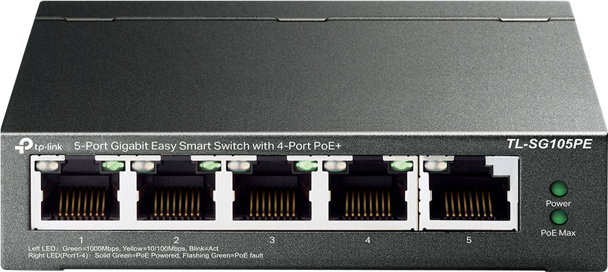 This 5-Port Gigabit Desktop Switch with 4-Port PoE provides seamless network connection. Its fully compatible with PoE devices, such as IP cameras, access points, and IP phones. It also works with non-PoE wired devices, such as PCs, printers, and IPTV. Compliance with the 802.3af/at PoE+ standard supports up to 30W on each PoE port. The total 65W PoE power budget* for the 4× gigabit PoE+ ports makes it has wide range of applications, such as surveillance, offices, dormitories, and small businesses. Not only does it ensure smooth traffic for latency-sensitive applications, such as voice and video but also ensures a better network experience, especially for applications like IPTV, by optimising multimedia traffic delivery. Helps to create network with higher security and better overall performance by dividing network into smaller groups. The switch offers network monitoring for users to observe traffic behaviour. Through its web-based user interface and management utility, it offers a variety of useful features, including network monitoring, traffic prioritisation, and enhanced QoS. The interior components of TL-SG105PE are protected by high-quality metal casing to ensure a long product life. Having passed an array of stringent reliability tests, TL-SG105PE delivers switching performance you can depend on. Size: 99.8W × 98D × 25Hmm Package Contents TL-SG105PE 5 Port Gigabit PoE Switch Power Adapter Installation Guide Rubber Feet