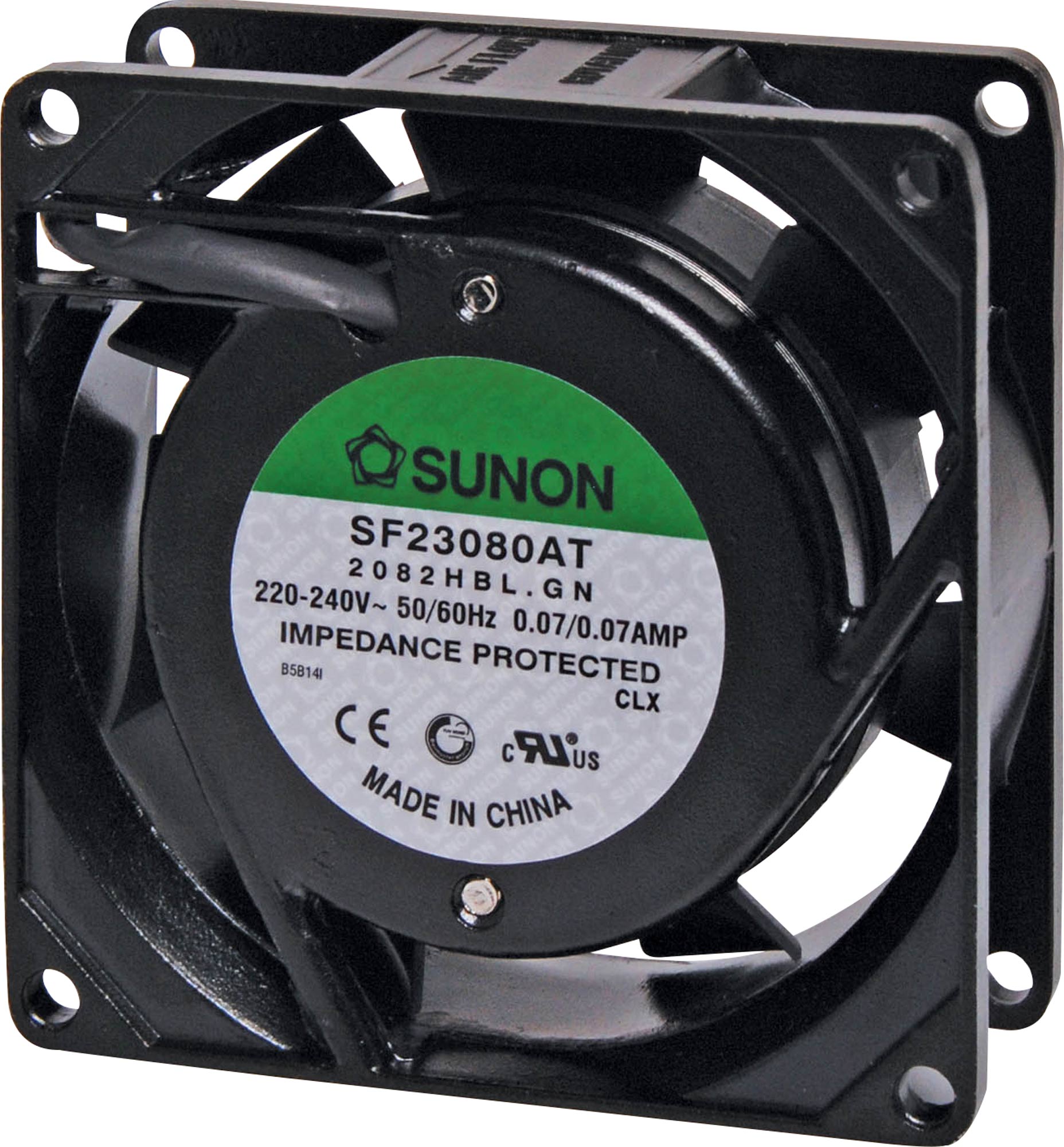 Sunon SF23080AT-2082HBL.GN 240V AC 80mm Ball Bearing Cooling Fan with diecast aluminium frame. Designed for long-life and minimal noise operation. Sunon® fans are manufactured to a very high standard and hold CSA and UL listings. Altronics has been a Sunon distributor for many years and have found them to be of excellent overall quality and reliability. Note: Other models are available for your specific OEM requirements, please contact us for details.