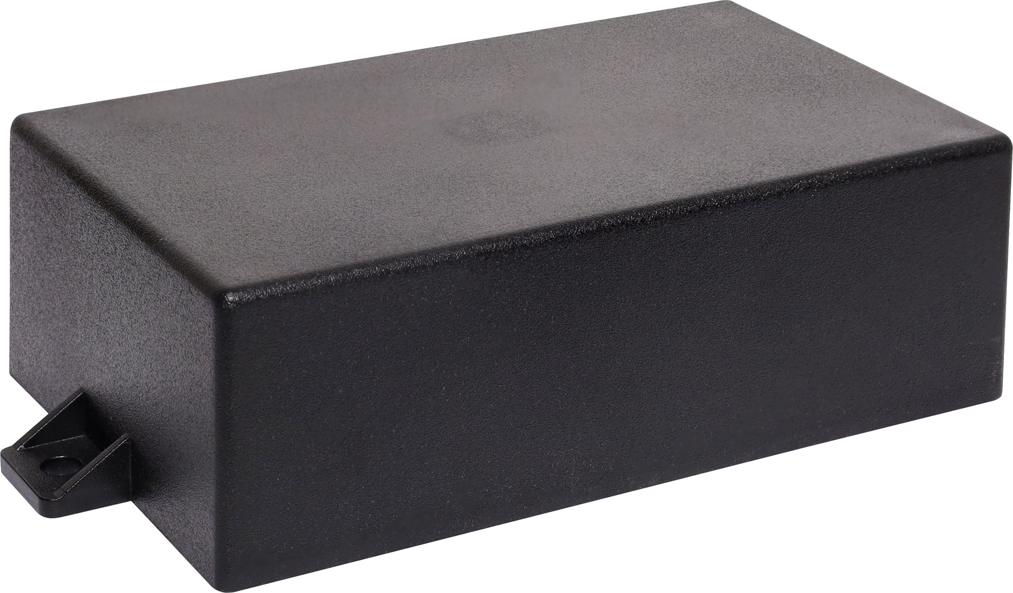 Compact plastic housing with mounting flanges. UL 94-HB.