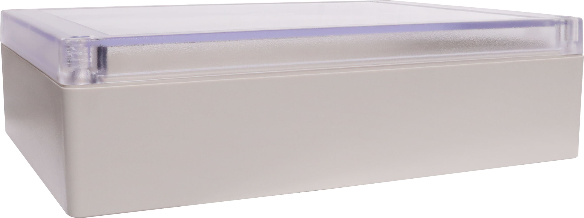 Supplied with neoprene lid sealing gasket. With the seal installed, these enclosures meet IP65 dust and hose proof standard. Supplied with a transparent lid (available with a solid grey lid, see H 0312A). PCB mounting points are moulded into the enclosure