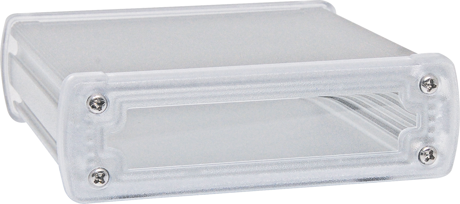 These rugged extruded silver anodised aluminium boxes are fitted with clear polycarbonate end caps for a professional finish. Extrusion has 5 PCB internal mounting ribs. Tough single piece extruded design. Includes four rubber feet.