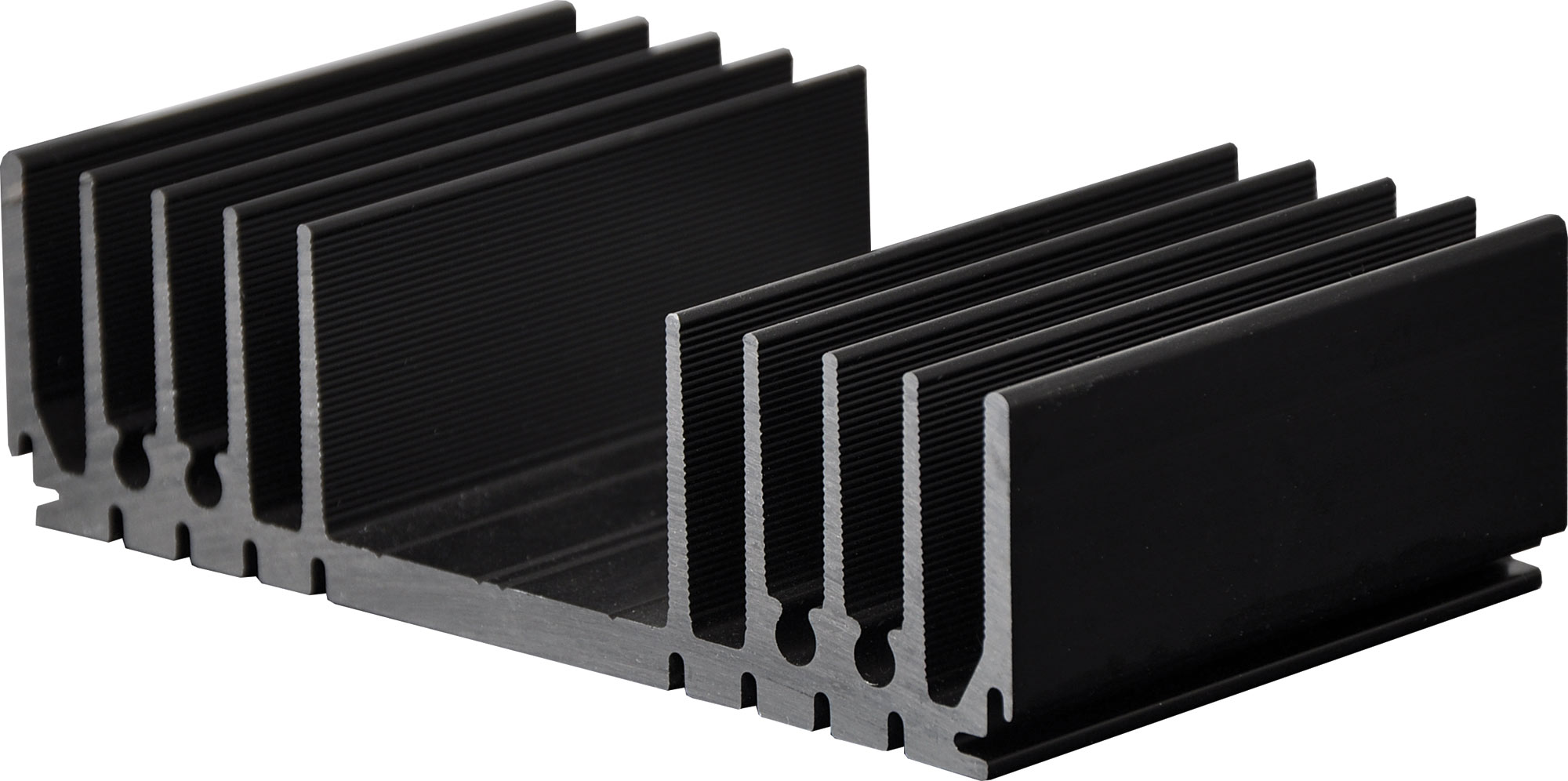 Black anodised. Incorporates a number of recessed "channels" on the flat side to enable self tapper screw fixing from chassis etc, without the need to drill holes. Other recesses are provided to mate with 1mm sheet metal thus allowing the construction of