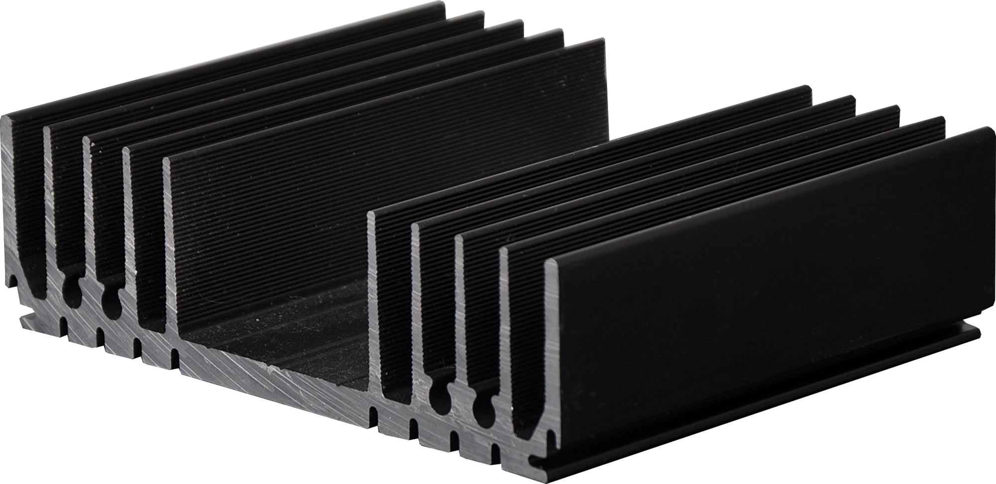 Black anodised. Incorporates a number of recessed "channels" on the flat side to enable self tapper screw fixing from chassis etc, without the need to drill holes. Other recesses are provided to mate with 1mm sheet metal thus allowing the construction of