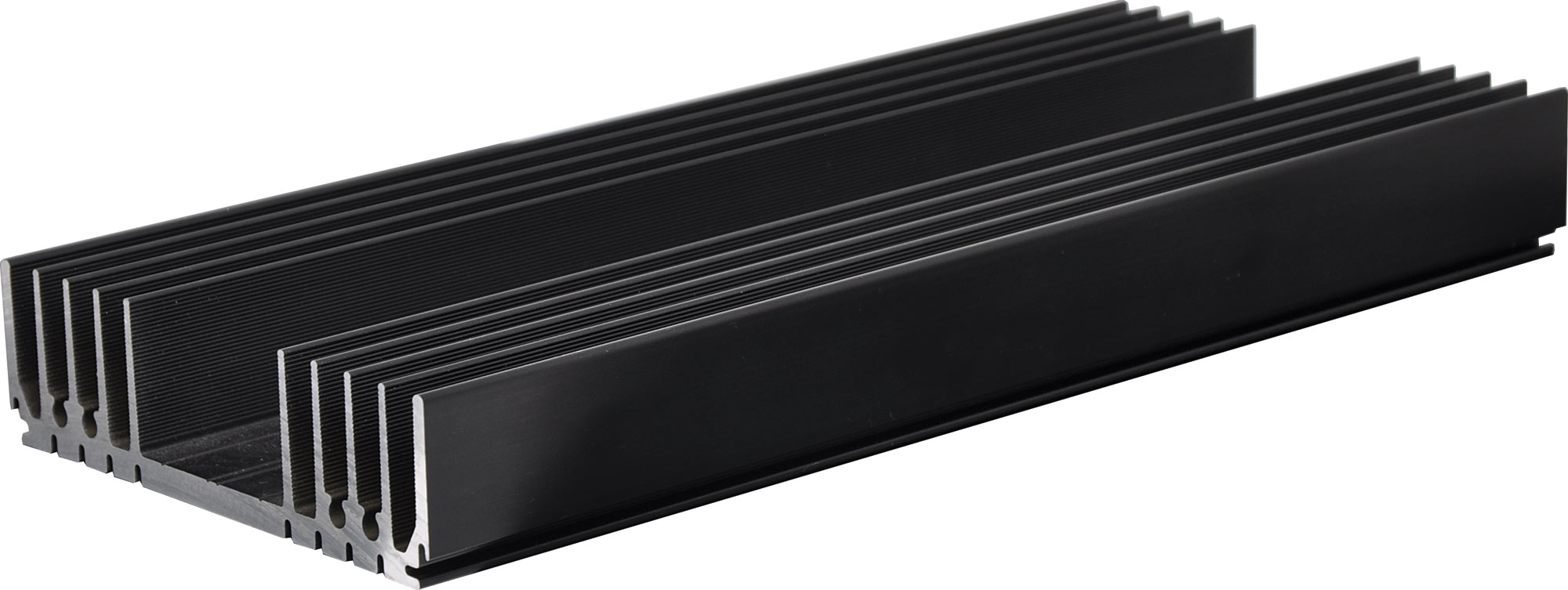Black anodised. Incorporates a number of recessed "channels" on the flat side to enable self tapper screw fixing from chassis etc, without the need to drill holes. Other recesses are provided to mate with 1mm sheet metal thus allowing the construction of