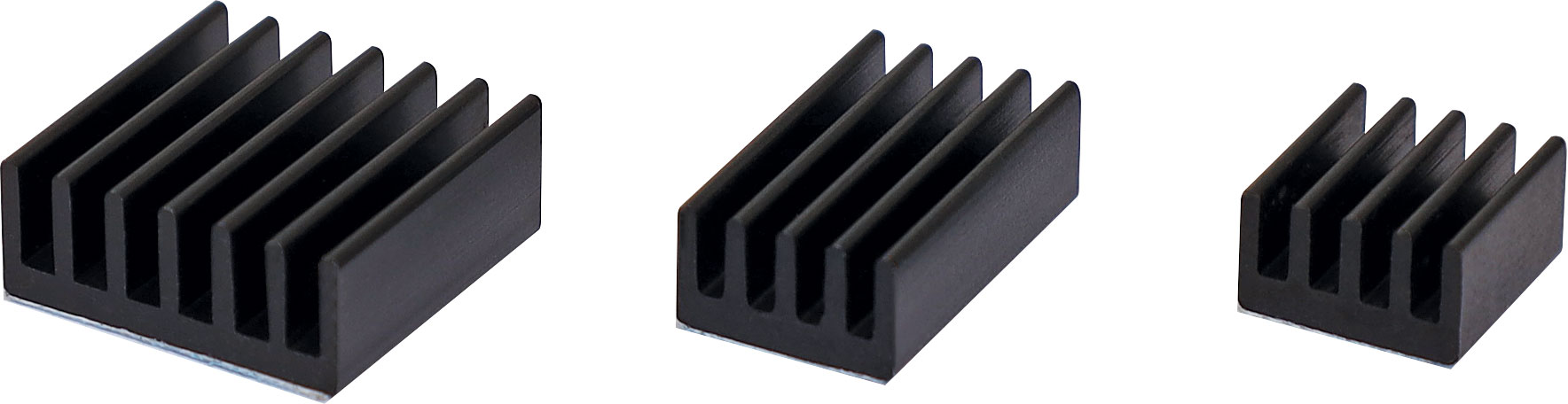 A 3 piece set of heatsinks to help cool the CPU, USB controller and RAM chips on the Pi 4. Peel and stick thermal tape backing. Also suitable for use with other development boards.