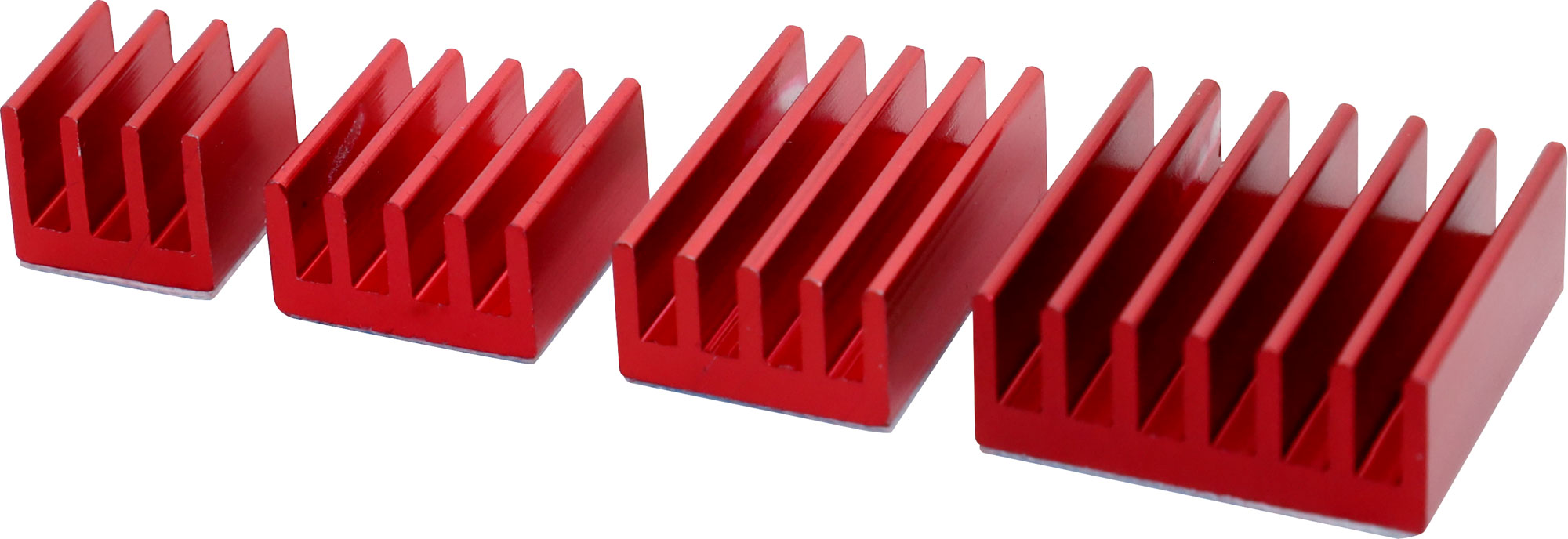 A 4 piece set of heatsinks to help cool the CPU, USB controller and RAM chips on the Pi 4. Peel and stick thermal tape backing. Also suitable for use with other development boards.