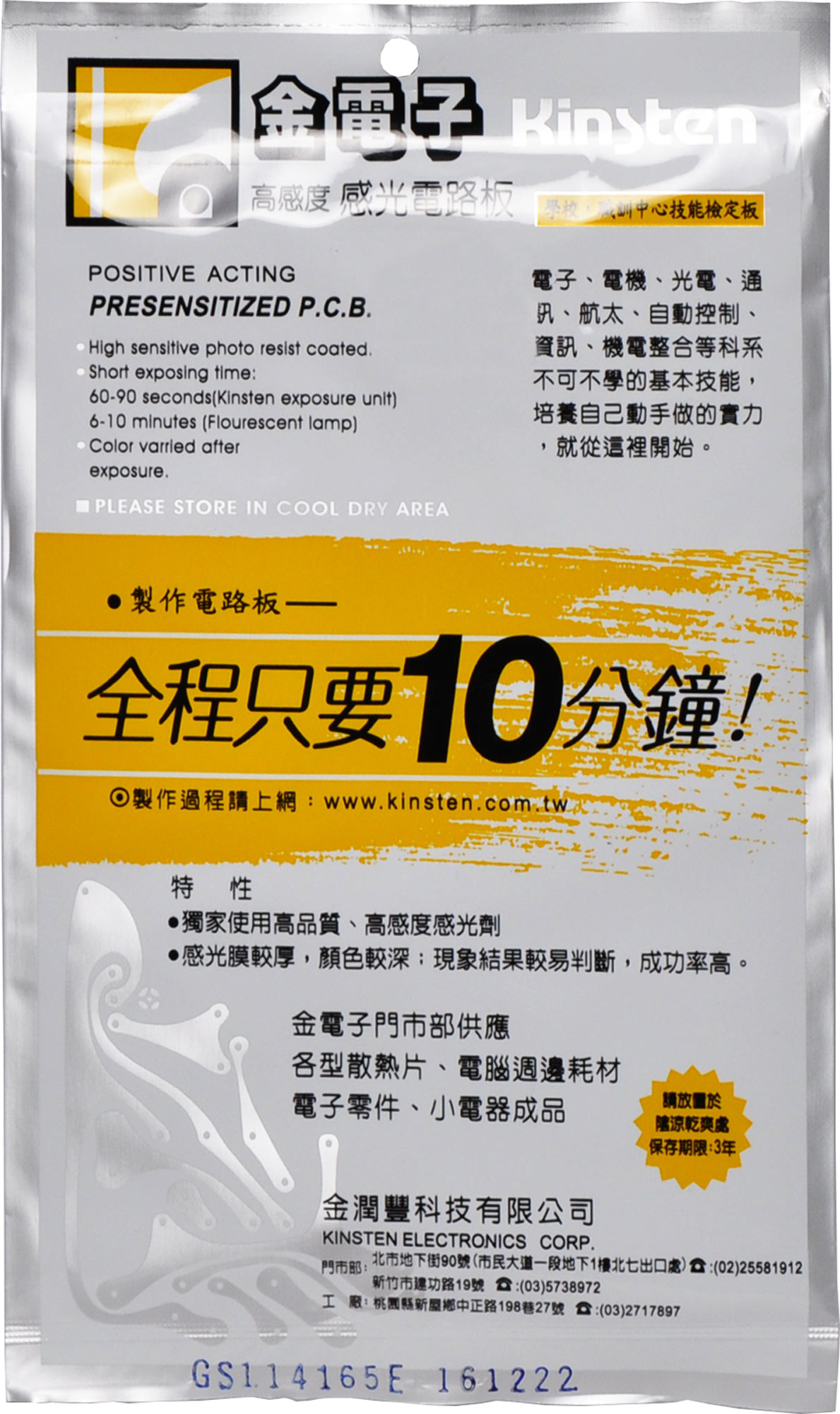 Fibreglass positive resist coated 1.6mm, 1oz copper, blank PCB’s for use with Kinsten developer solution H 0798. Ideal for low volume prototyping & electronics design. Single-sided 114 x 165mm