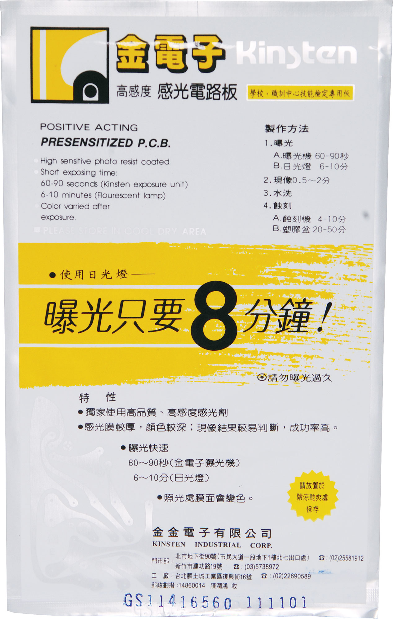 Fibreglass positive resist coated 1.6mm, 1oz copper, blank PCB’s for use with Kinsten developer solution H 0798. Ideal for low volume prototyping & electronics design. Double-sided 114 x 165mm