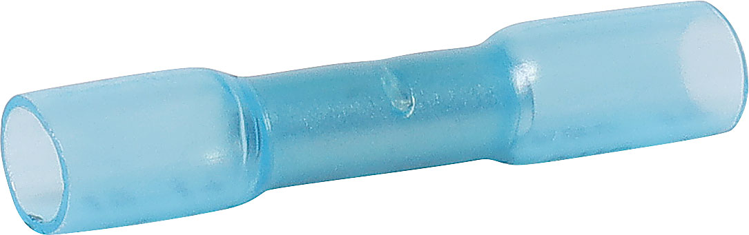 A pack of 10 blue buttsplice double ended crimps designed for joining wiring. The IP66 rated weatherproof design features a heat shrinkable outer sheath which seals out dust and moisture for a corrosion resistant join. Ideal for use in engine bays, along vehicle or trailer chassis etc where wiring can be in exposed areas. Cable entry size: 1.3 - 2.0mm Ø, 16 - 14AWG. Pack of 10.