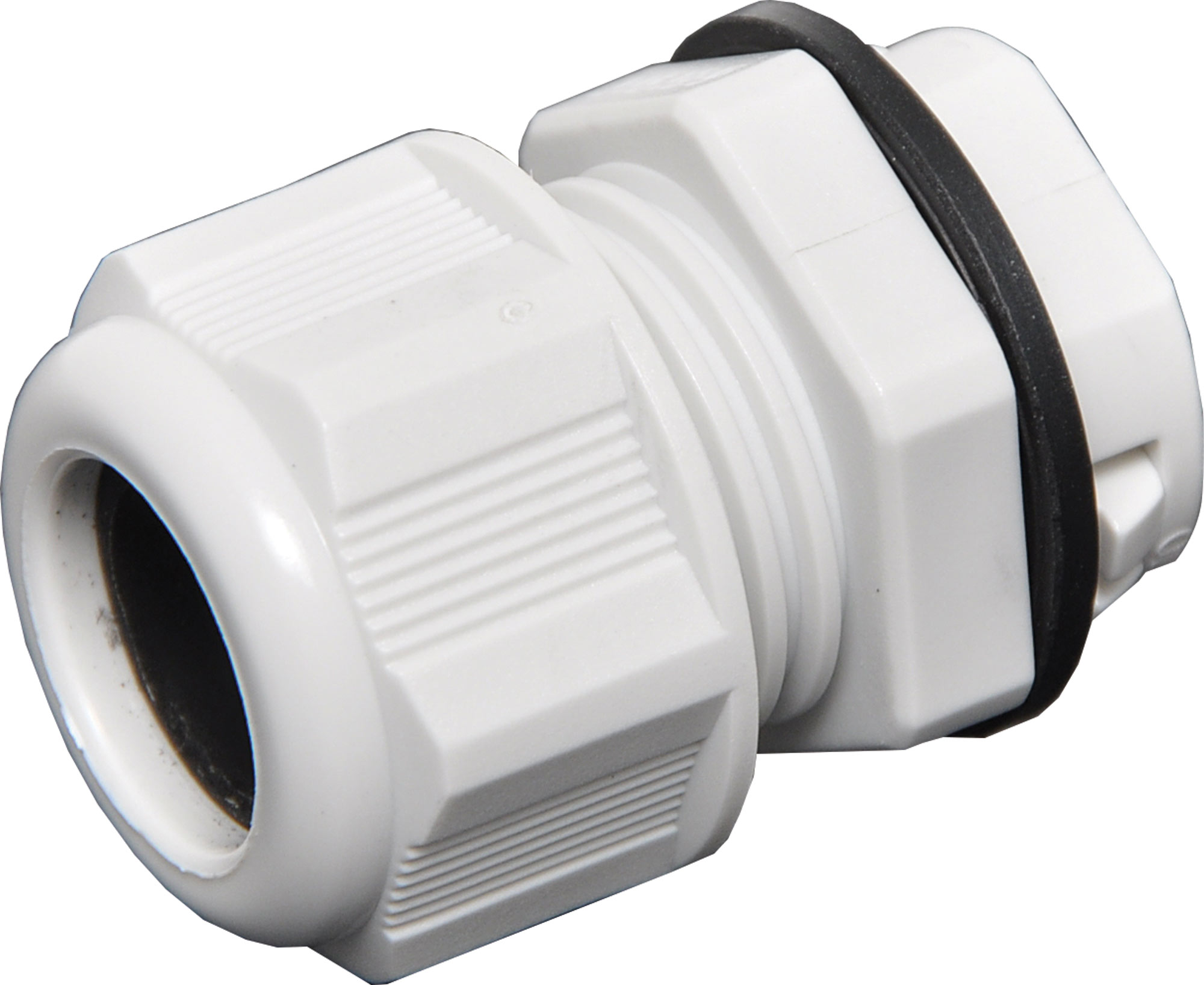 A snapfit grey cable gland made from fire retardant plastic for 9-12.5mm OD cable PG11 size cable gland with IP68 ingress protection rating. Multi-piece cable glands with rubber clamping ring for sealing cable apertures in weatherproof equipment or speaker enclosures. Constructed from flame retardant plastic materials. Suits cable diameter 9mm t