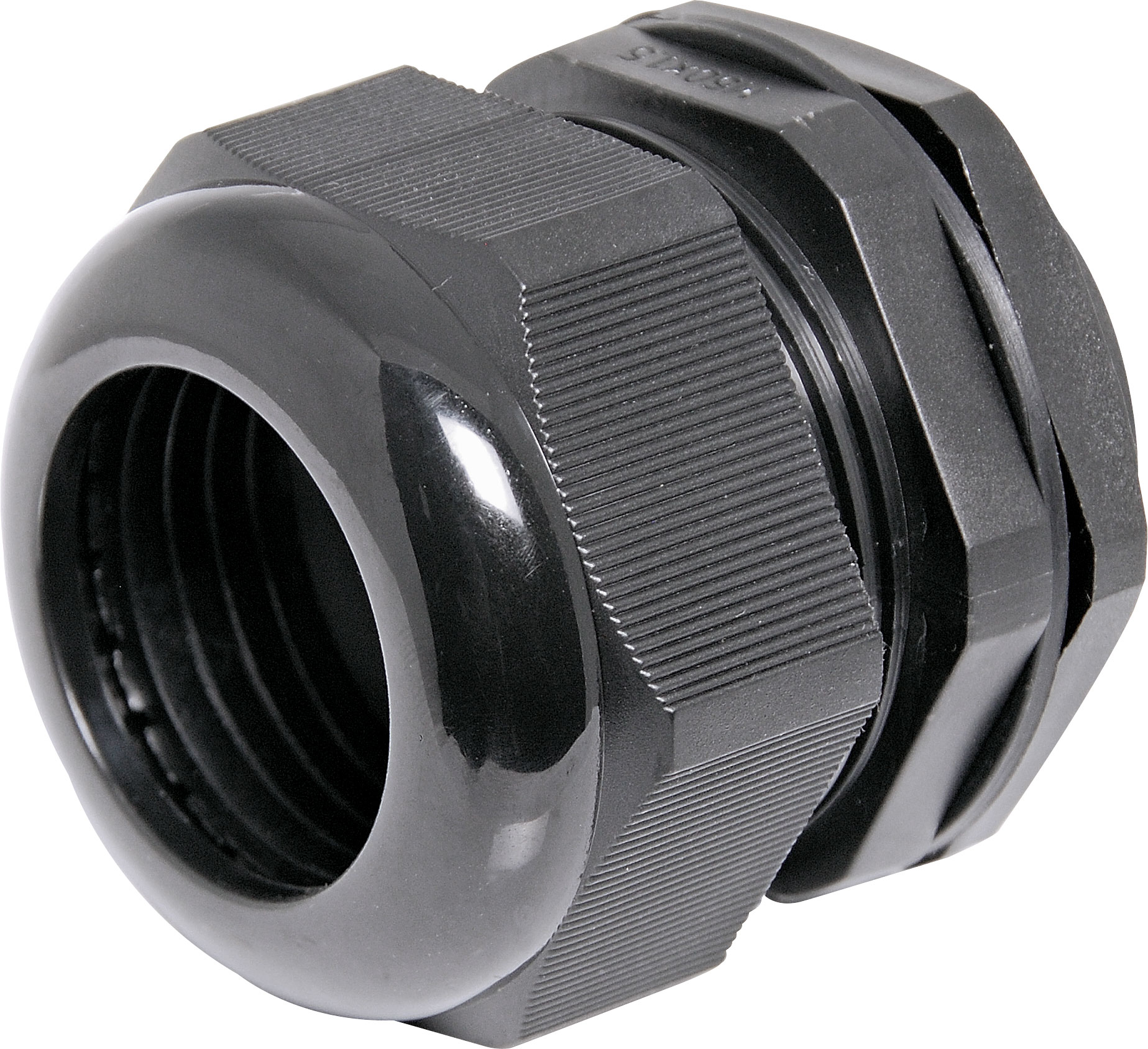 IP68 cable gland with rubber clamping ring for a weatherproof cable seal. UL94 Nylon. All metric thread type. Colour: Black Thread: MG50 Cable entry: 32-38mm Panel cutout diameter: 50mm Depth from chassis: 49mm