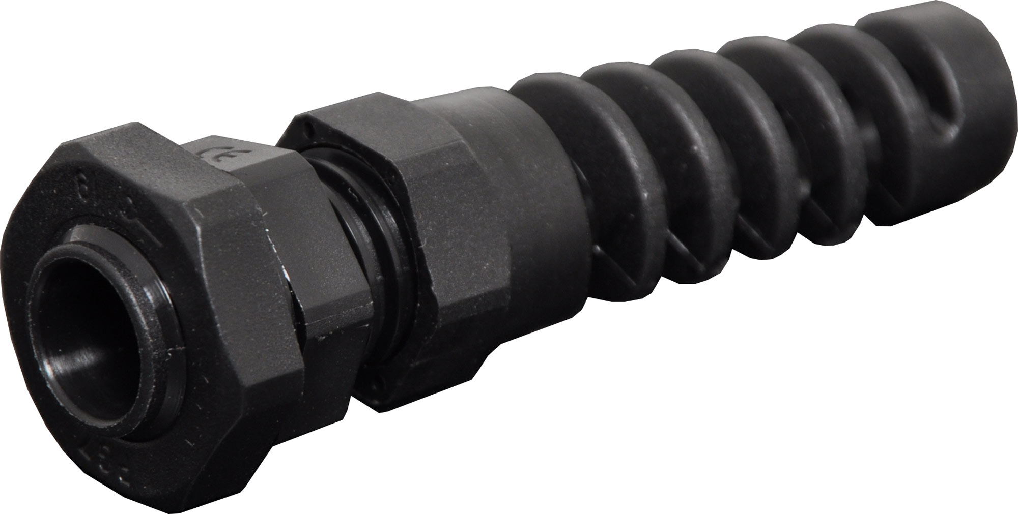 Strain relief gland suits cable 3mm to 6.5mm diameter. Mounting hole Ø 14mm Multi-piece cable glands with rubber clamping ring for sealing cable apertures in weatherproof equipment or speaker enclosures. Suits panels up to 8mm thick.