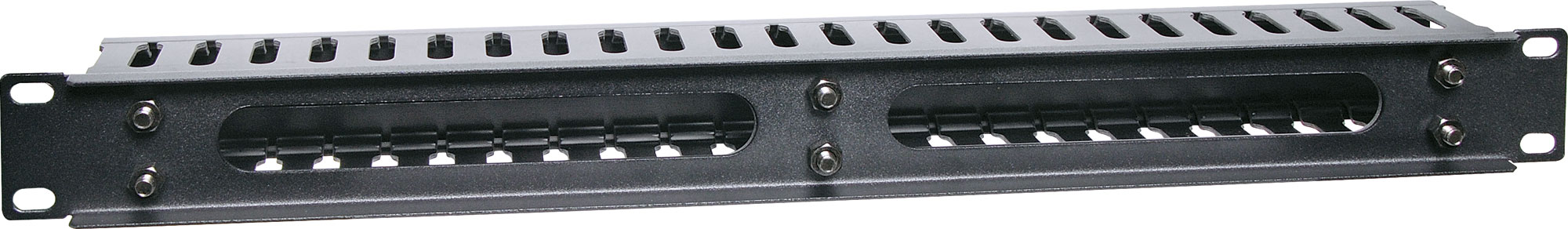 Slotted panels for management of patch leads in IT and comms racks. Durable black powder coated finish. Features plastic slotted tabs and slide on rear panel cover for a neat finish. Dimensions: 44H x 480W x 63D mm