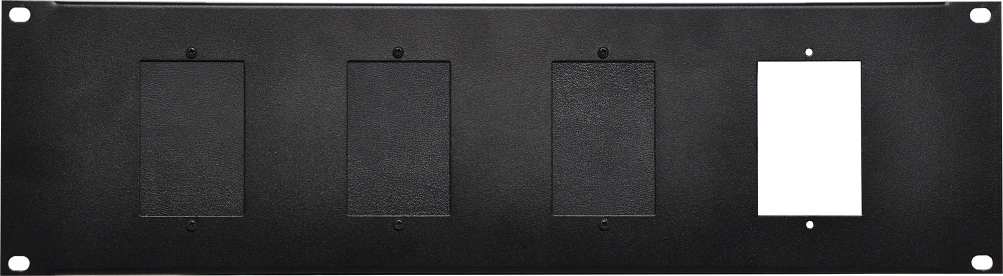 This 3RU plate provides mounting for up to 4 standard electrical wall plates. This allows installers to mount zone control wall plates, such as the Redback A4490 series, into a rack environment. Supplied with three blanking plates and matching hardware. Note: Wall plate used for illustration purposes. Not included.