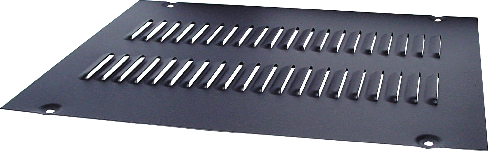 A vented steel panel designed to suit the 600mm range of black rack frames. It is louvered to allow heat to flow up and away from the cabinet but reduce the amount of dust and dirt collected on top of the equipment within the rack.