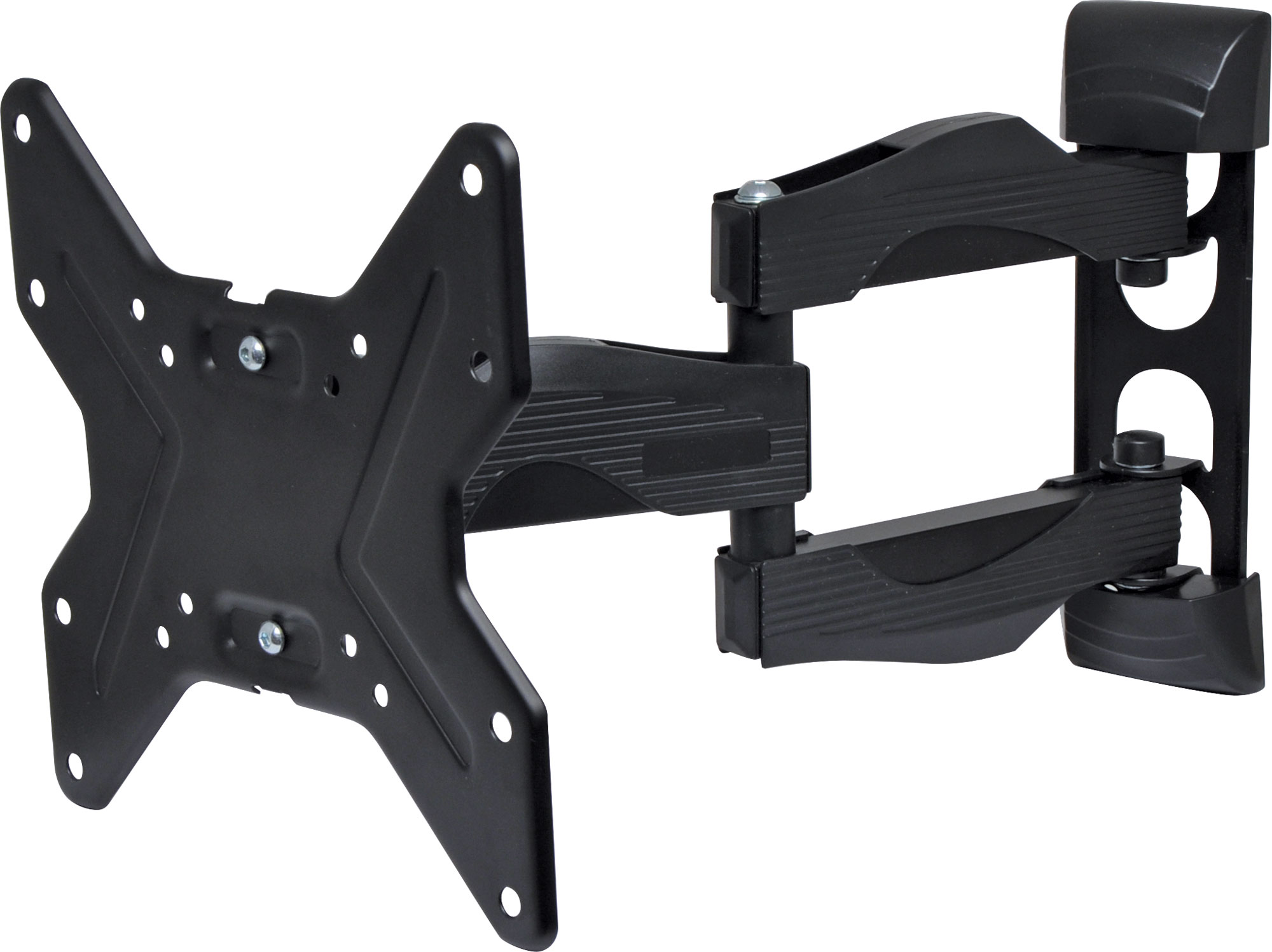 A compact articulated wall bracket for television screens up to 42” in size and 25kg in weight. Max distance from wall 342mm, folds flat to 52mm from wall surface. Provides 180° of adjustment and 15° of tilt. Mounting hole centres at 50mm, 75mm and 200mm square.