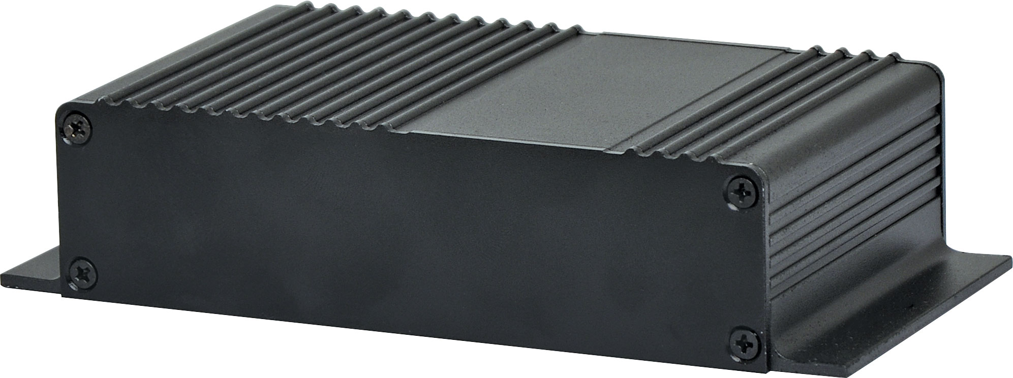 Extruded single piece aluminium case. Flat aluminium end plates can be milled, screened and customised to suit your requirements. Finned extrusion adds thermal dissipation for heat sinked applications. Two internal ribs for PCB mounting. Anodized black finish. External dimensions: 63W x 131D x 30H mm (flanged)