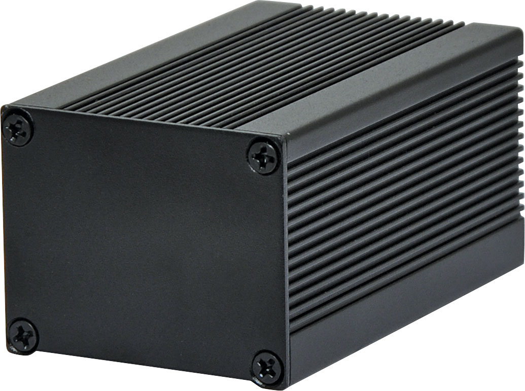 Extruded single piece aluminium case. Flat aluminium end plates can be milled, screened and customised to suit your requirements. Finned extrusion adds thermal dissipation for heat sinked applications. Two internal ribs for PCB mounting. Anodized black finish. External dimensions: 40W x 50D x 83H mm