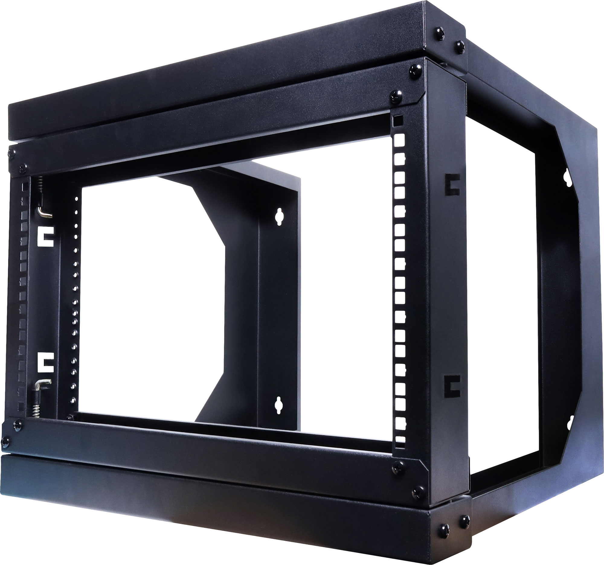 An open frame hinged wall mount 6RU 19” rack system designed for wall mounting equipment up to 420mm deep. Ideal for combinations of patch panels, security and audio equipment. Spring loaded latches secure the front face closed. When opened, the entire front face opens to allow access to the rear of mounted equipment. 6RU size is perfect for small comms and audio racks. Overall depth from wall 460mm. Dimensions: 525W x 460D x 452H mm (Maximum equipment depth 420mm) Ideal for the following applications: DVR and security equipment Background music PA systems in small business. UPS power backup equipment Patch panels and switches Telephone systems and PABX Network and comms gear