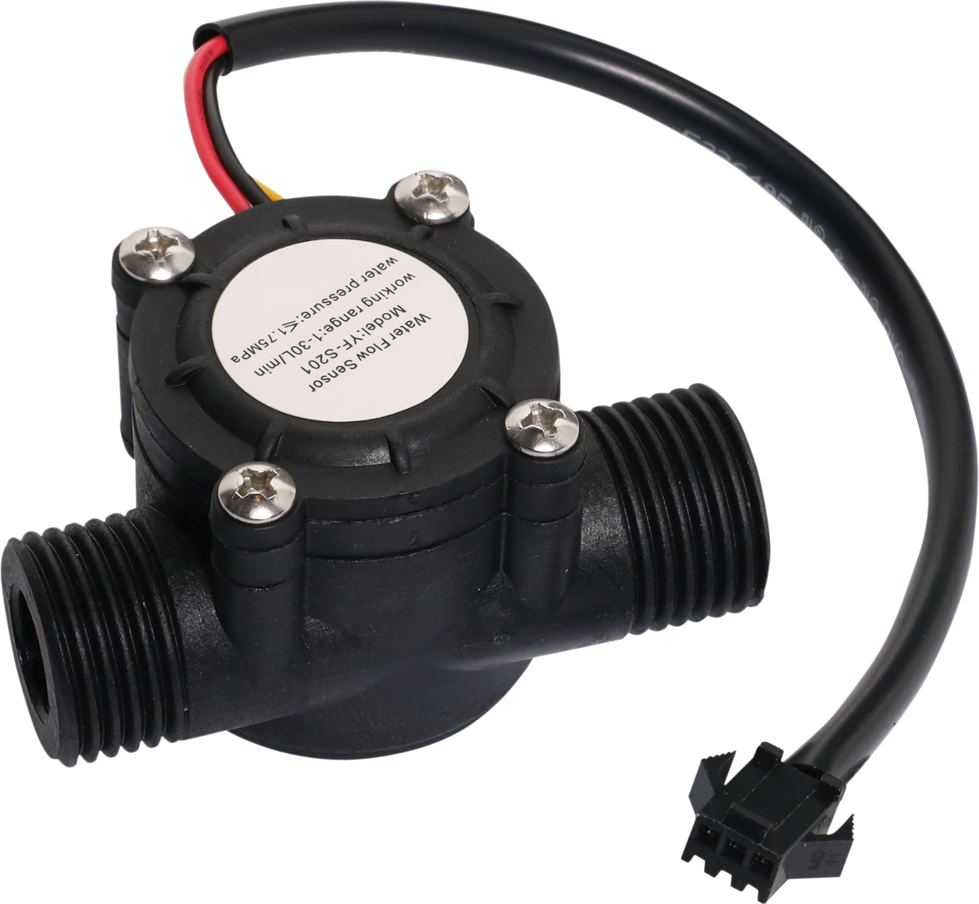This Hall Effect Water Flow Meter Sensor incorporates a pin wheel sensor and fits inline with a hose or pipe and measures the amount of liquid that has flown through it. It integrates a sealed magnetic hall effect ensor outputs an electrical pulse with every revolution. Its also sealed from the water pipe and allows the sensor to stay safe and dry. The YF-S201 Hall Effect Water Flow Meter Sensor comes with three wires: red (5-24VDC power), black (ground) and yellow (Hall effect pulse output). By counting the pulses from the output of the sensor, you can easily calculate water flow. Each pulse is approximately 2.25 milliliters. Please Note this isn’t a precision sensor, and the pulse rate does vary a bit depending on the flow rate, fluid pressure, and sensor orientation. It will need careful calibration if better than 10% precision is required.