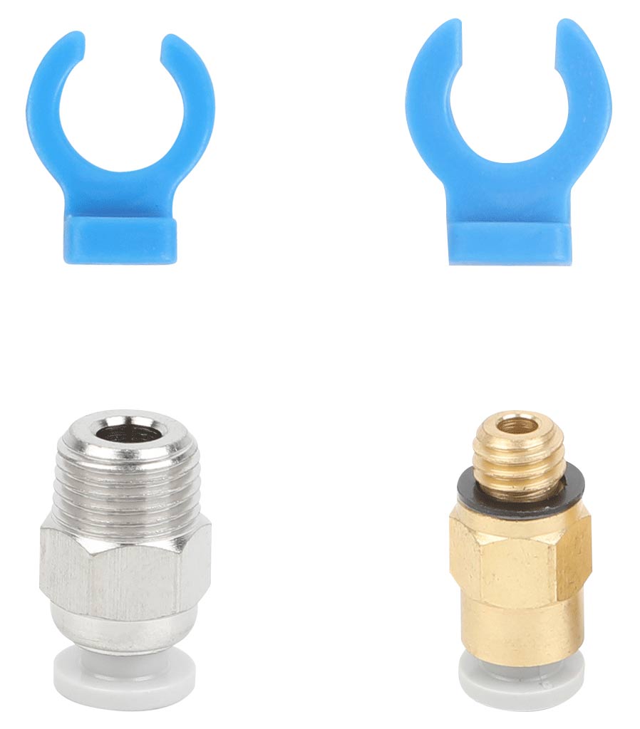 Replacement pneumatic connectors to suit Creality Ender and other brands/types of 3D printer. Includes extruder and hot end threaded fittings and tube clips.